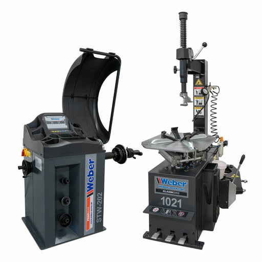 Tire service package consisting of a side-swing tire mounting machine from the Weber Classic series and a wheel balancing machine from the Weber Pr...