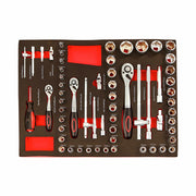 • 22-piece socket wrench set consisting of: 1/2" ratchet with 17 sockets, extensions, universal joint and T-handle