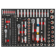 - 33-piece socket wrench set consisting of: 1/2" ratchet with 18 short and 11 long sockets, extensions, universal joint