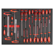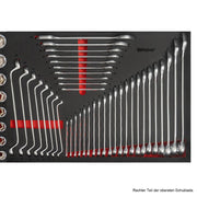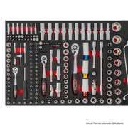 - 33-piece socket wrench set consisting of: 1/2" ratchet with 18 short and 11 long sockets, extensions, universal joint