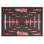 - 31-piece socket wrench set consisting of: 1/4" ratchet with 18 short and 7 long sockets, extensions, T-handle, universal joint, rotary handle