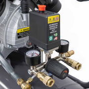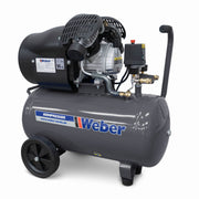 The compact Weber air compressor with a 10 bar operating pressure and a 50-liter tank is perfect for use in the workshop, garage, or around the home. With its oil-lubricated, direct-drive, 2-cylinder unit and high working pressure, it ensures maximum performance and reliability despite its space-saving design. Thanks to its sturdy plastic wheels and convenient carrying handle, the air compressor is mobile and therefore easy to use. The pressure switch and pressure regulator allow for simple and precise adjustment of the working pressure, simplifying operation. The integrated pressure gauge enables quick and easy pressure readings. The quick-release coupling makes it easy to connect all kinds of pneumatic tools, while a safety valve and condensate drain plug on the tank provide the necessary safety.