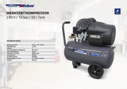 Compact workshop compressor with 10 bar operating pressure, 50 liter tank and 230 V electrical connection.